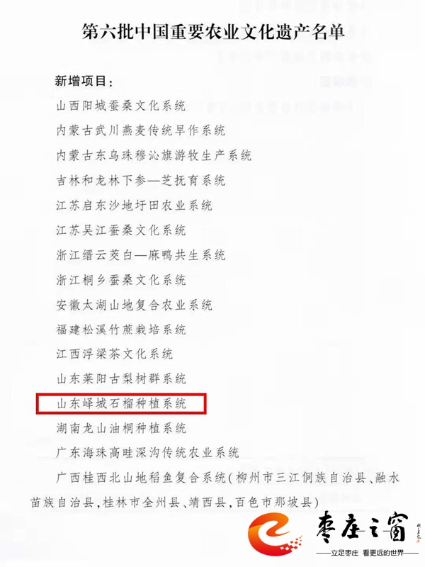 11月16日,農(nóng)業(yè)農(nóng)村部公布第六批中國重要農(nóng)業(yè)文化遺產(chǎn)名單,認定山西陽城蠶桑文化系統(tǒng)等21項傳統(tǒng)農(nóng)業(yè)系統(tǒng)為第六批中國重要農(nóng)業(yè)文化遺產(chǎn),其中嶧城石榴種植系統(tǒng)入選。